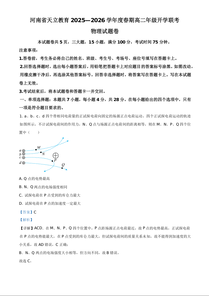 河南省周口市天立教育2025-2026学年高二下学期开学考试 物理答案.docx