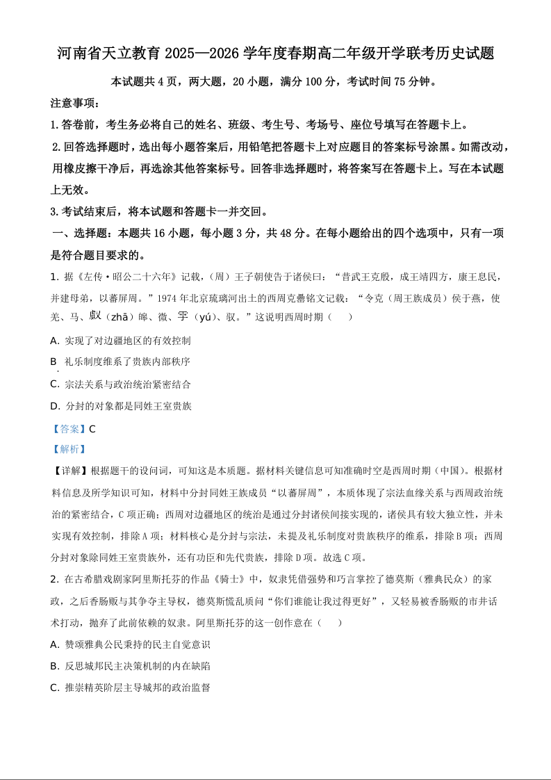河南省周口市天立教育2025-2026学年高二下学期开学考试 历史答案.docx