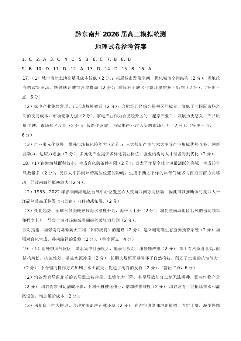 贵州省黔东南州2026届高三3月模拟统测 地理答案.docx