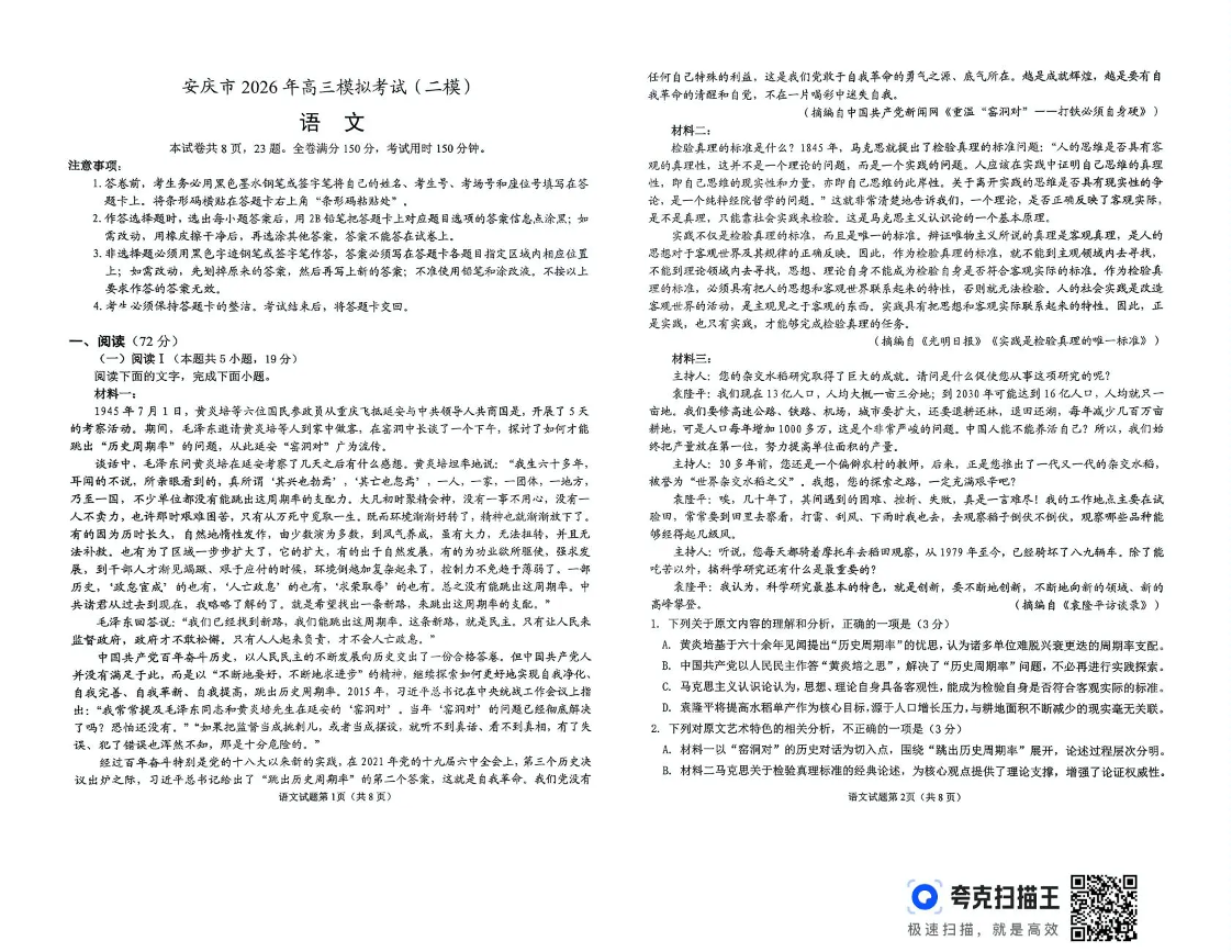 安庆市2026年高三模拟考试(二模)语文.pdf
