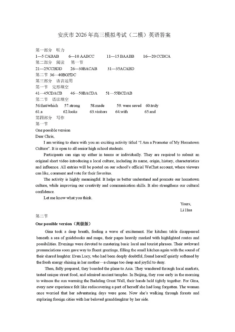 安庆市2026年高三模拟考试(二模)英语答案.pdf