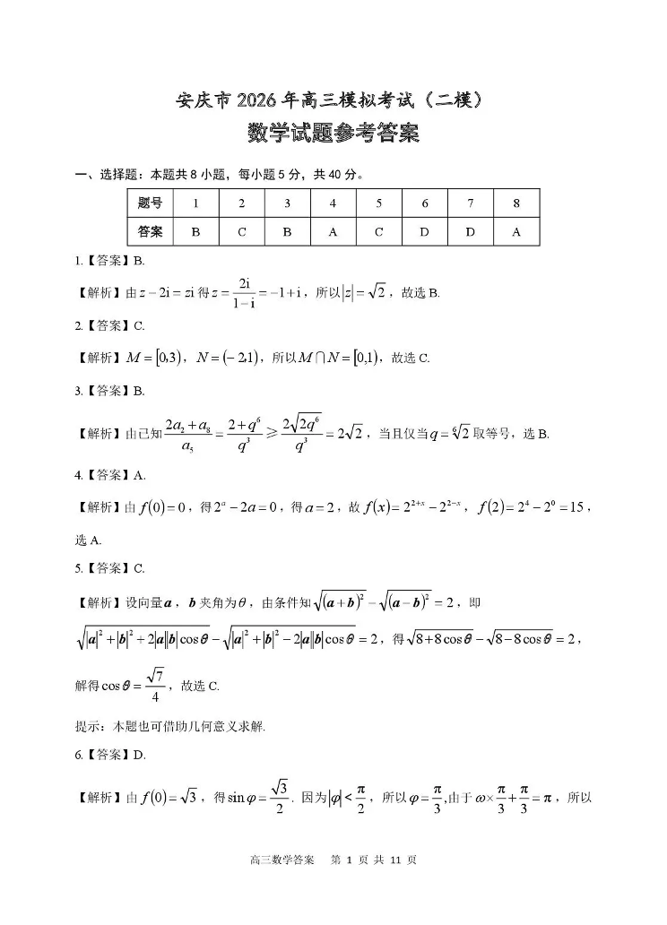 安庆市2026年高三模拟考试(二模)数学答案.pdf