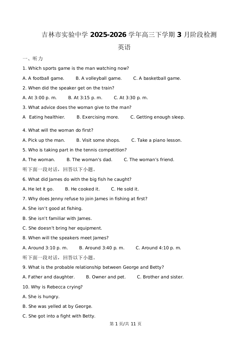 吉林省实验中学2026届高三下学期3月阶段检测 英语.docx