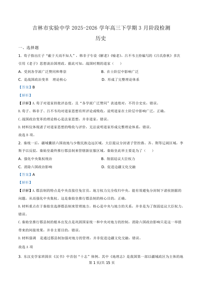 吉林省实验中学2026届高三下学期3月阶段检测 历史答案.docx