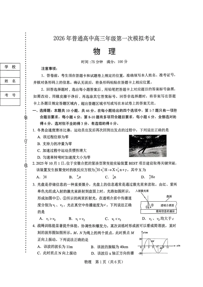 辽阳市2026年普通高中高三年级第一次模拟考试 物理.pdf