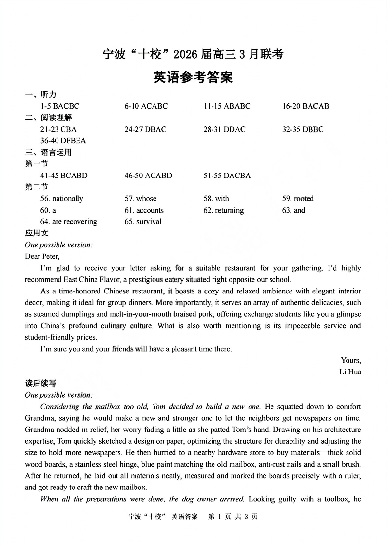 浙江省宁波十校2026届高三年级3月联考 英语答案.pdf