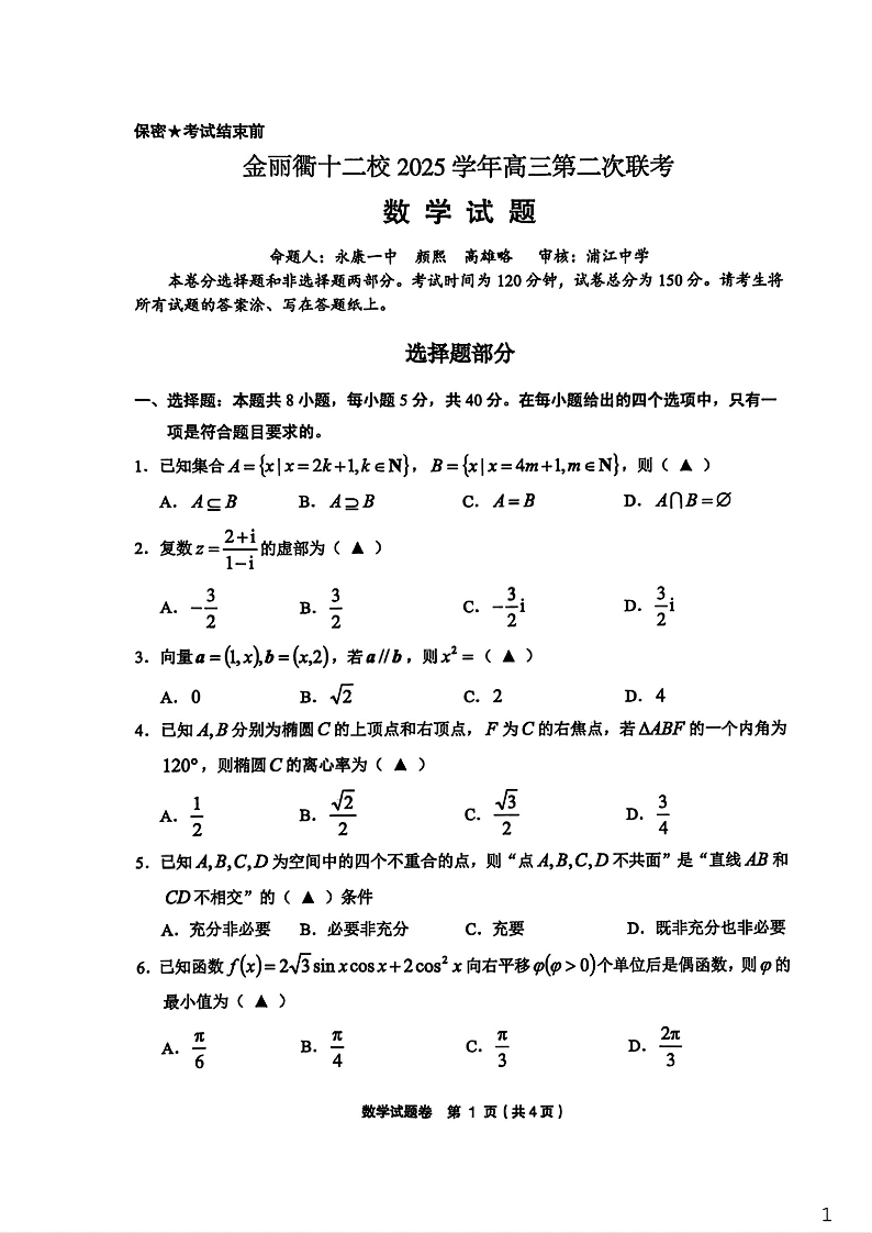 金丽衢十二校2025-2026学年度高三年级第二次联考 数学.pdf