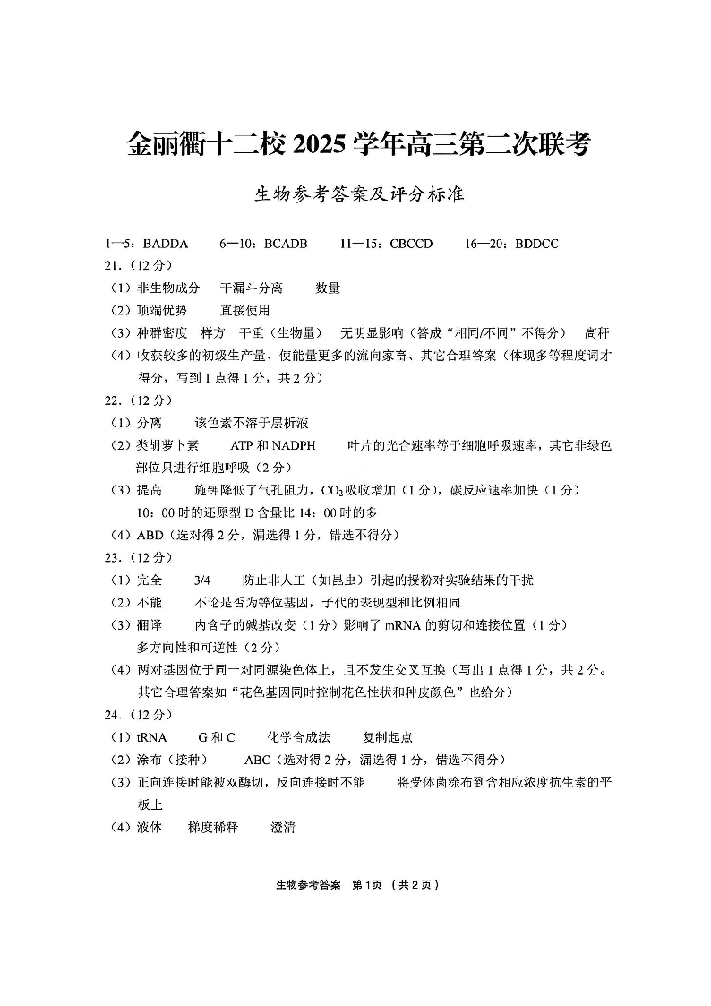 金丽衢十二校2025-2026学年度高三年级第二次联考 生物答案.pdf
