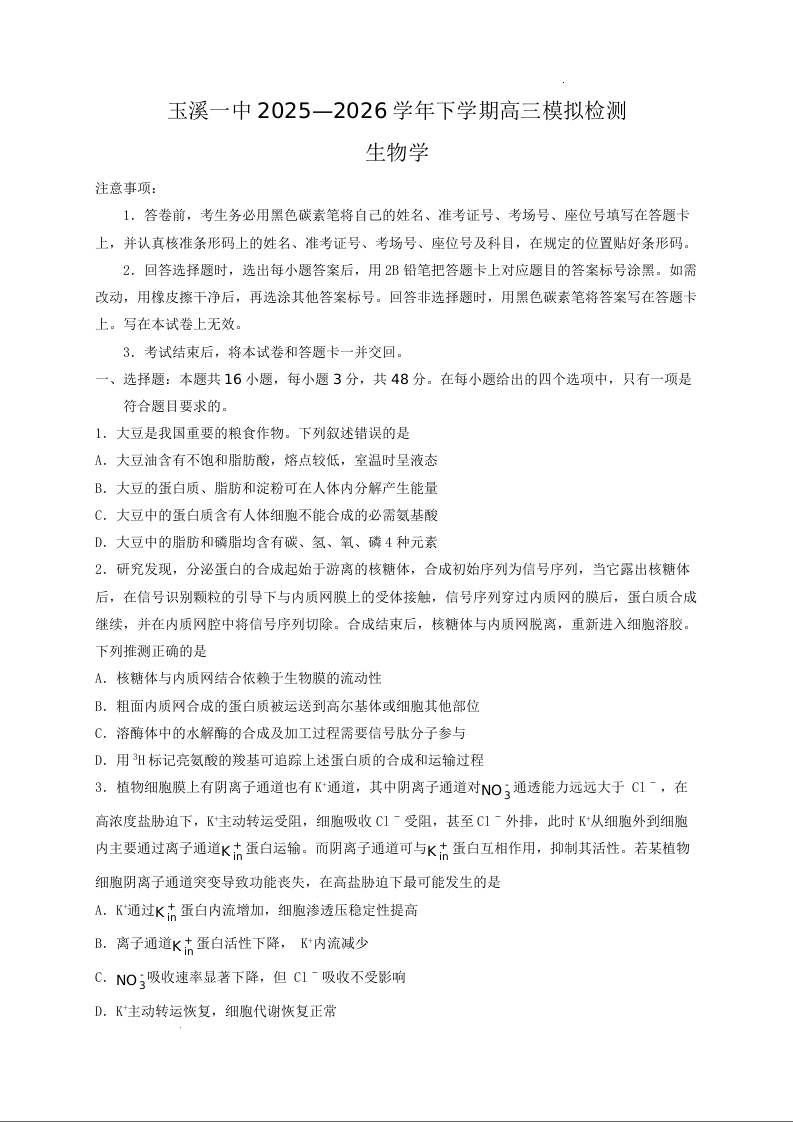 云南省玉溪第一中学2026届高三下学期3月模拟预测 生物.docx
