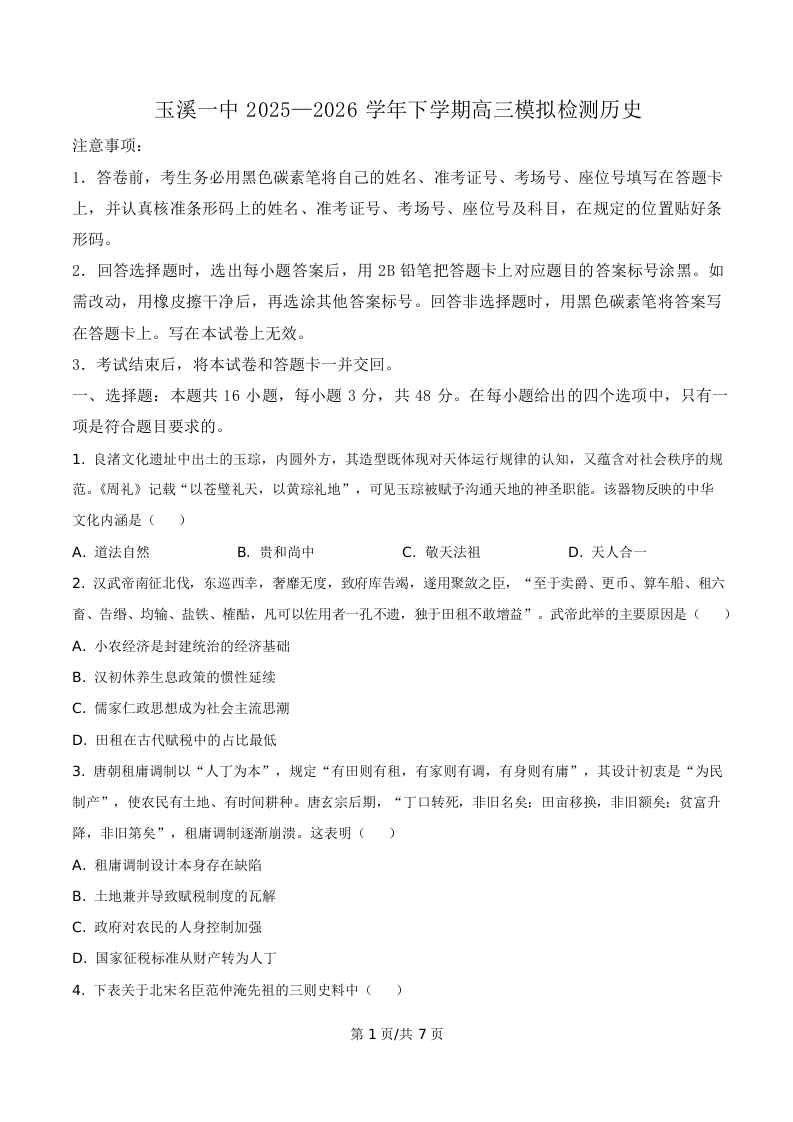 云南省玉溪第一中学2026届高三下学期3月模拟预测 历史.docx