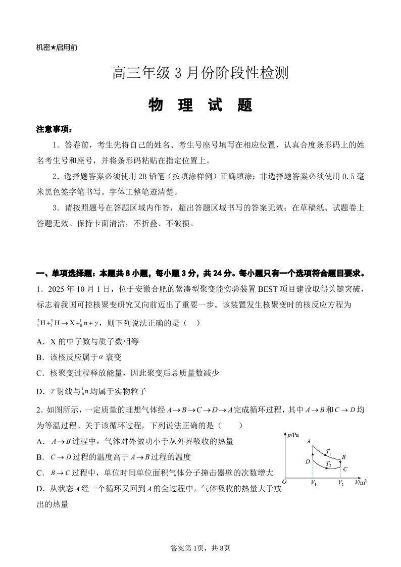 山东师范大学附属中学2026届高三下学期3月阶段检测 物理.pdf