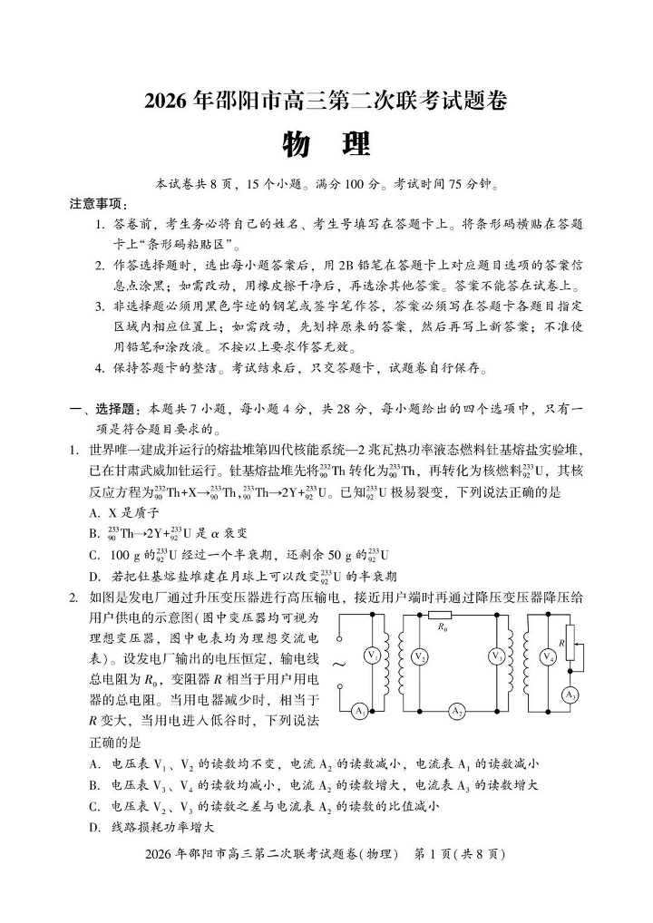 2026年邵阳市高三第二次联考试题卷 物理试题(含答案).pdf