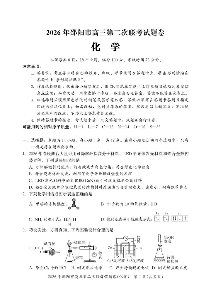 2026年邵阳市高三第二次联考试题卷 化学试题(含答案).pdf