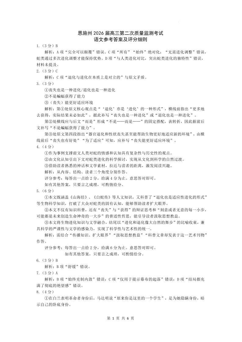 恩施州2026届高三第二次质量监测考试 语文答案.pdf