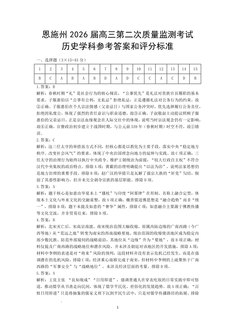 恩施州2026届高三第二次质量监测考试 历史答案.pdf