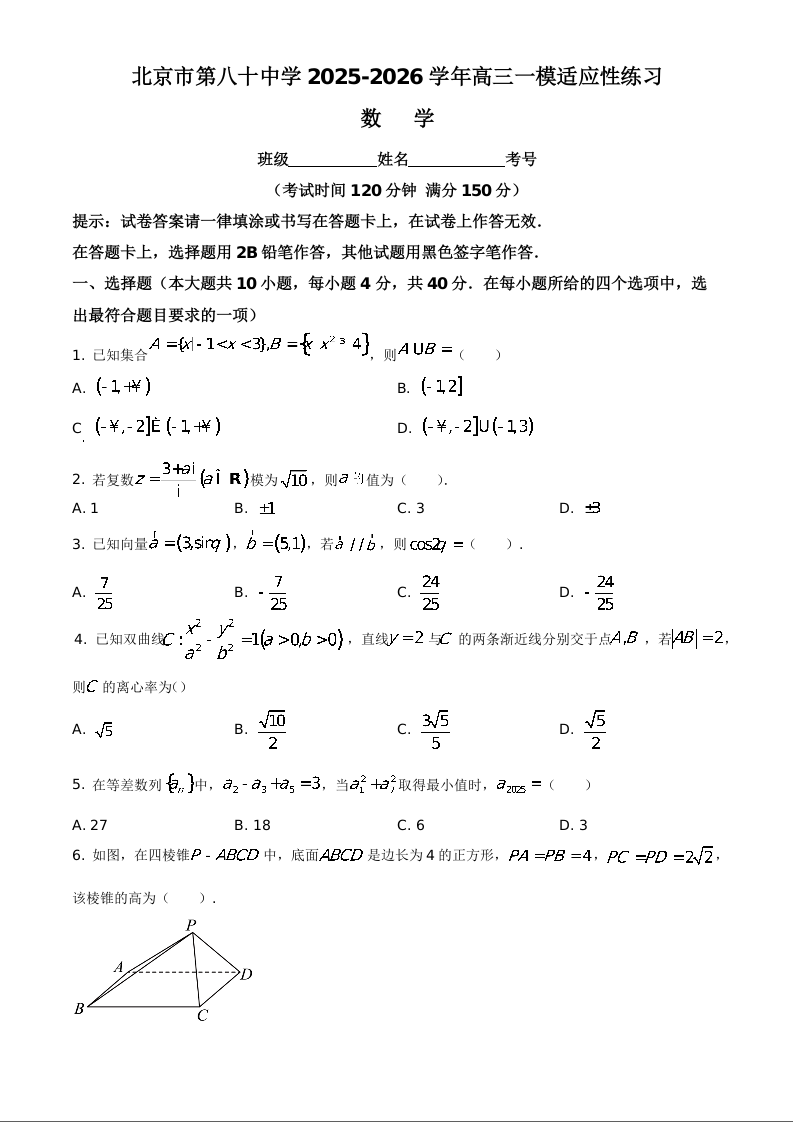 北京市第八十中学2026届高三下学期一模适应性练习 数学.docx