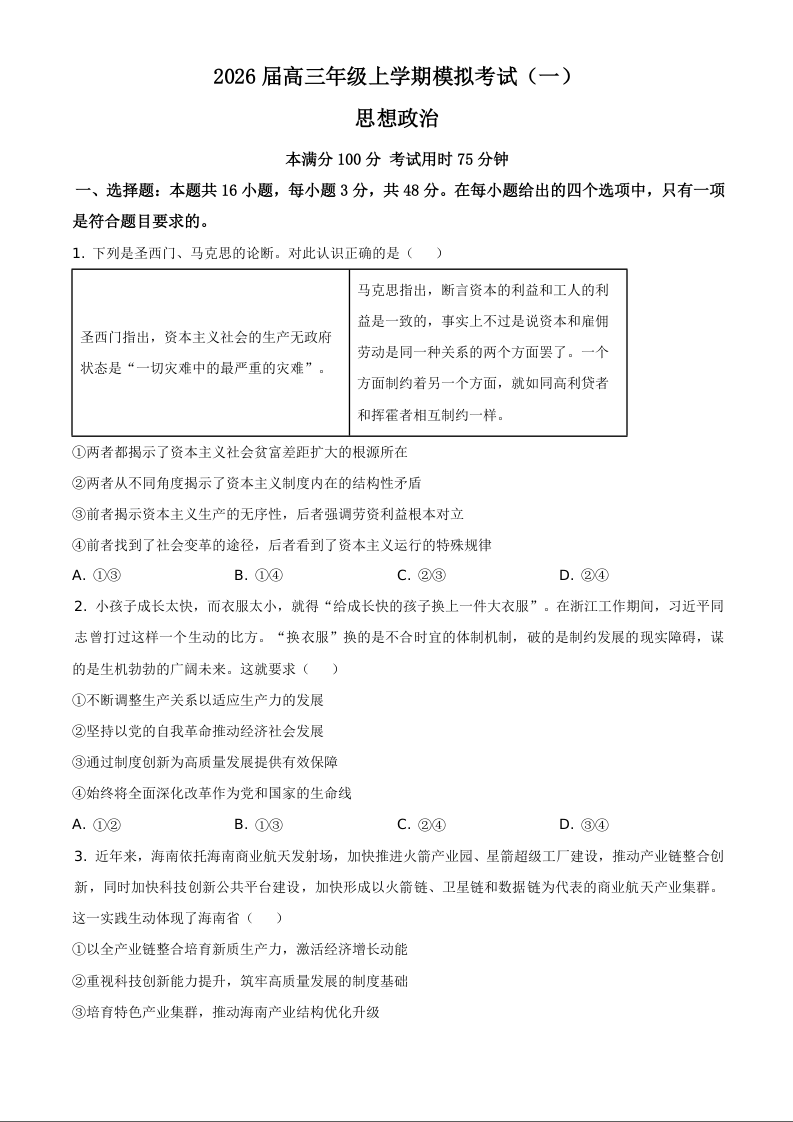 河北省名校协作体2026届高三上学期模拟考试(一)政治.docx