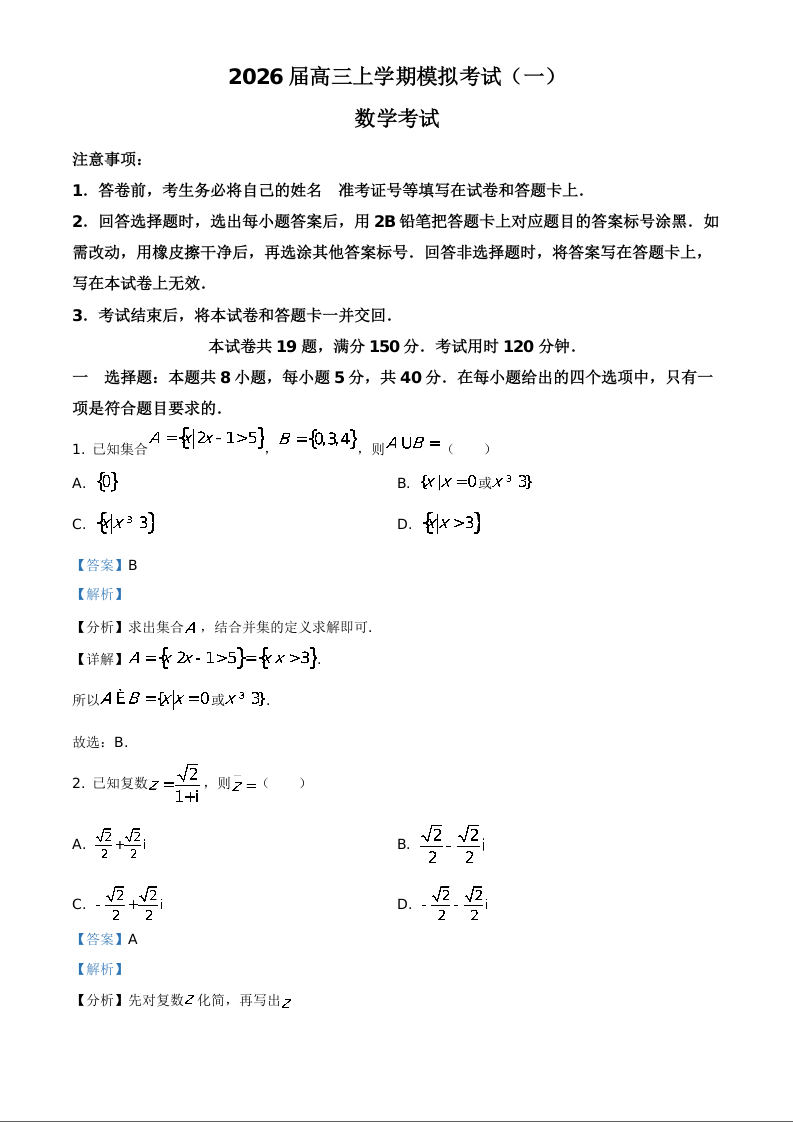 河北省名校协作体2026届高三上学期模拟考试(一)数学答案.docx