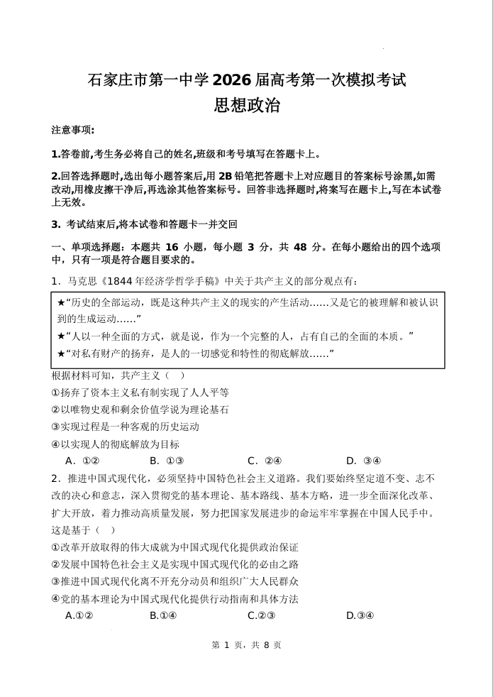河北石家庄市第一中学2026届高三高考第一次模拟考试 政治.docx