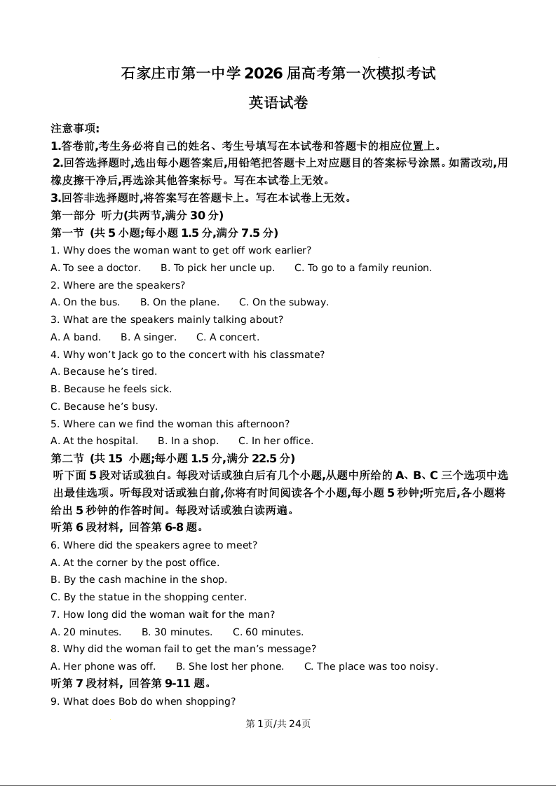 河北石家庄市第一中学2026届高三高考第一次模拟考试 英语答案.docx