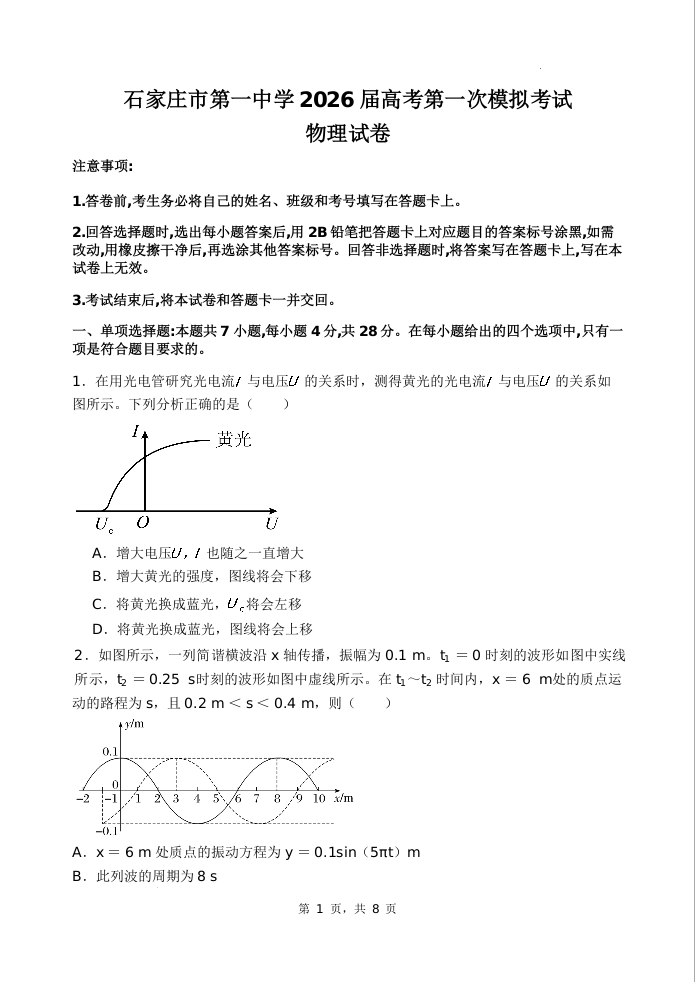 河北石家庄市第一中学2026届高三高考第一次模拟考试 物理.docx