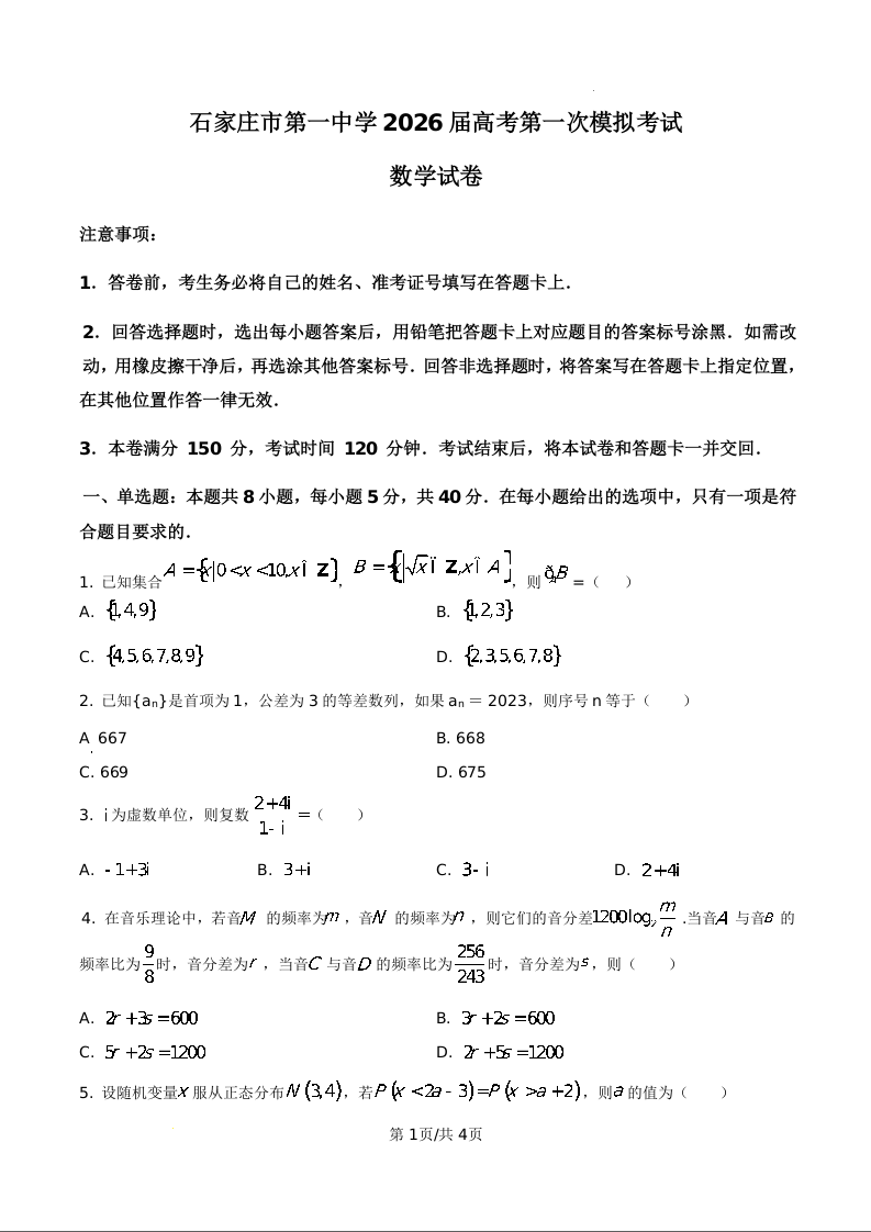 河北石家庄市第一中学2026届高三高考第一次模拟考试 数学.docx