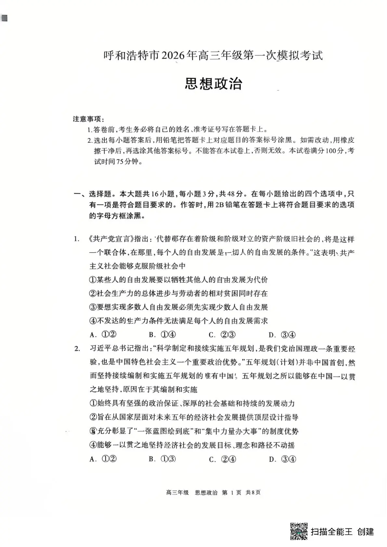 呼和浩特市2026年高三年级第一次模拟考试 政治.pdf