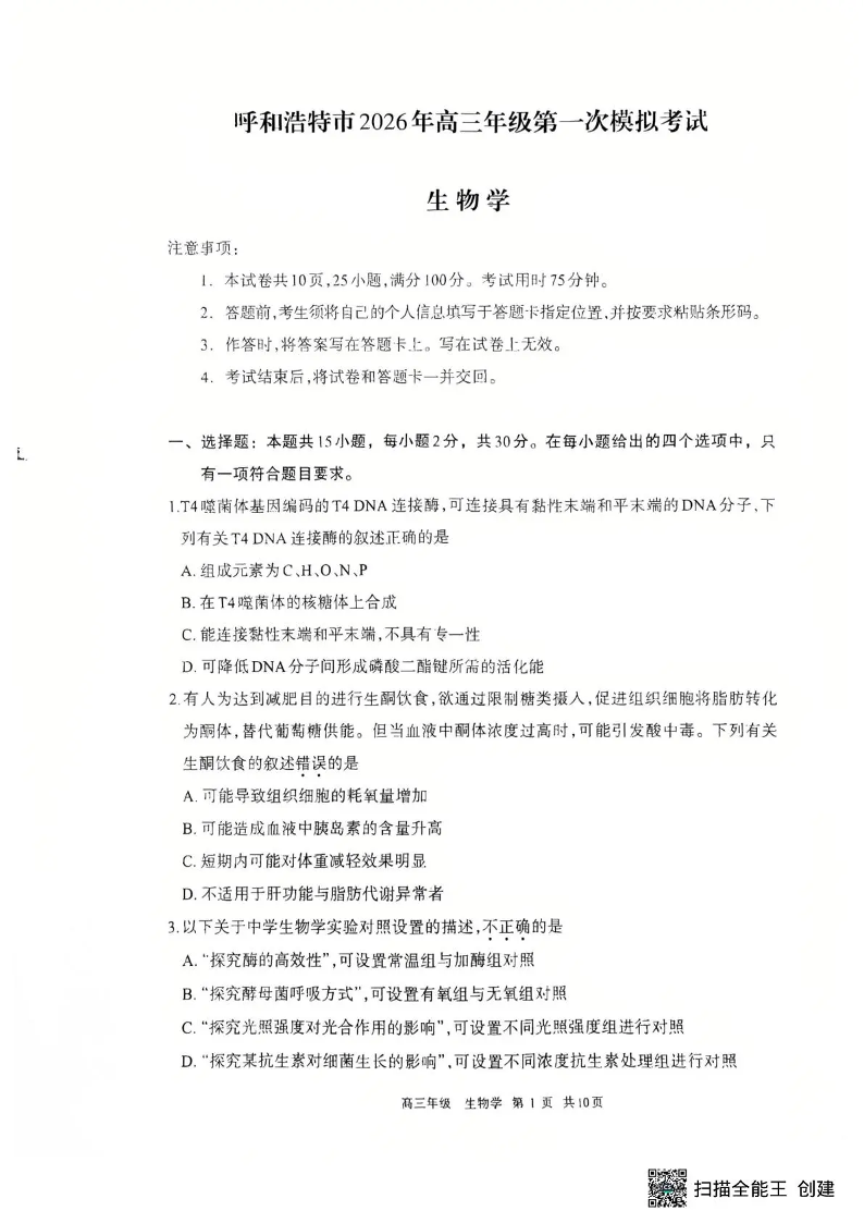 呼和浩特市2026年高三年级第一次模拟考试 生物.pdf