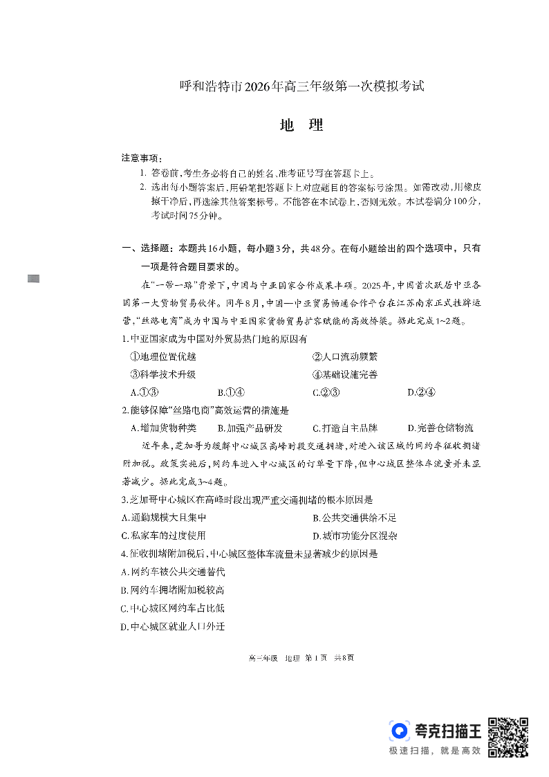 呼和浩特市2026年高三年级第一次模拟考试 地理.pdf