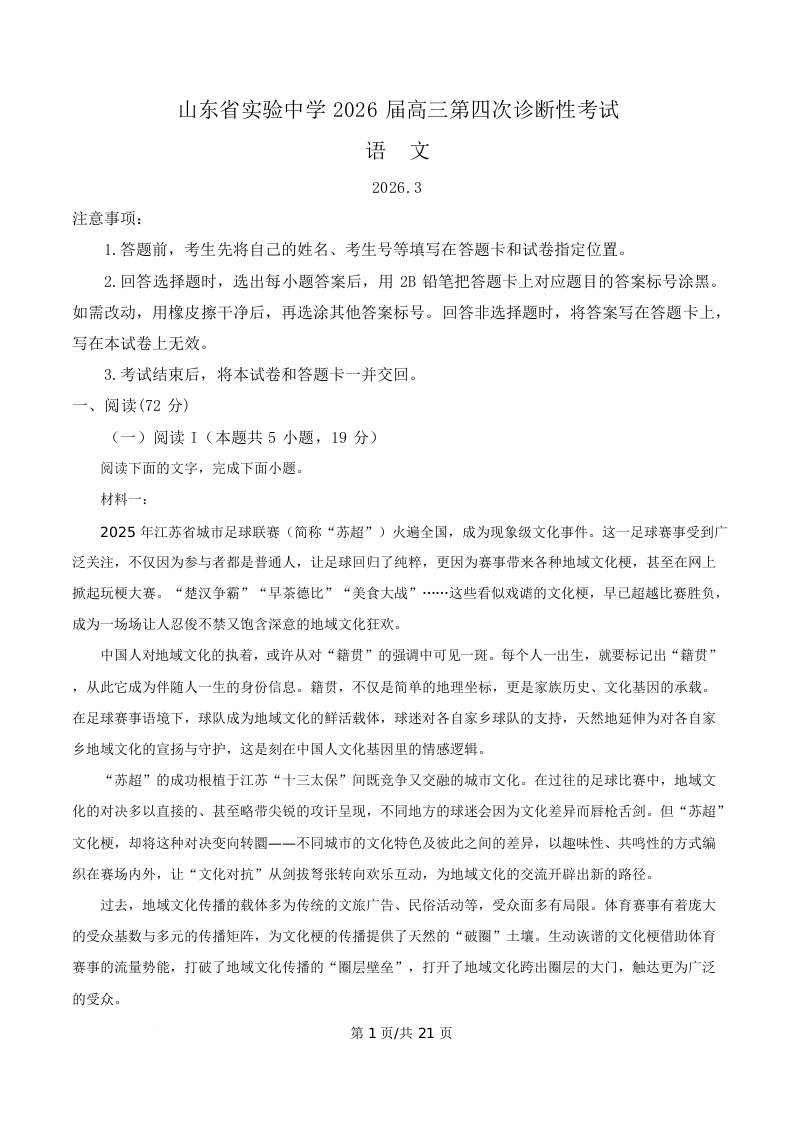 山东省实验中学2026届高三第四次诊断性考试 语文答案.docx