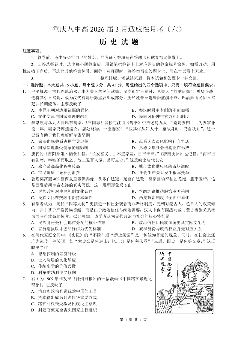 重庆市第八中学2026届高考适应性月考卷(六)历史.pdf