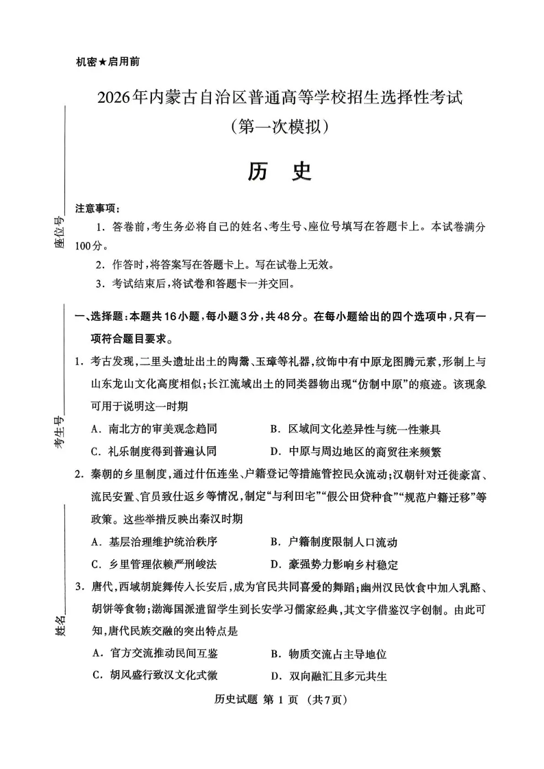 鄂尔多斯市2026届高三下学期一模考试 历史.pdf