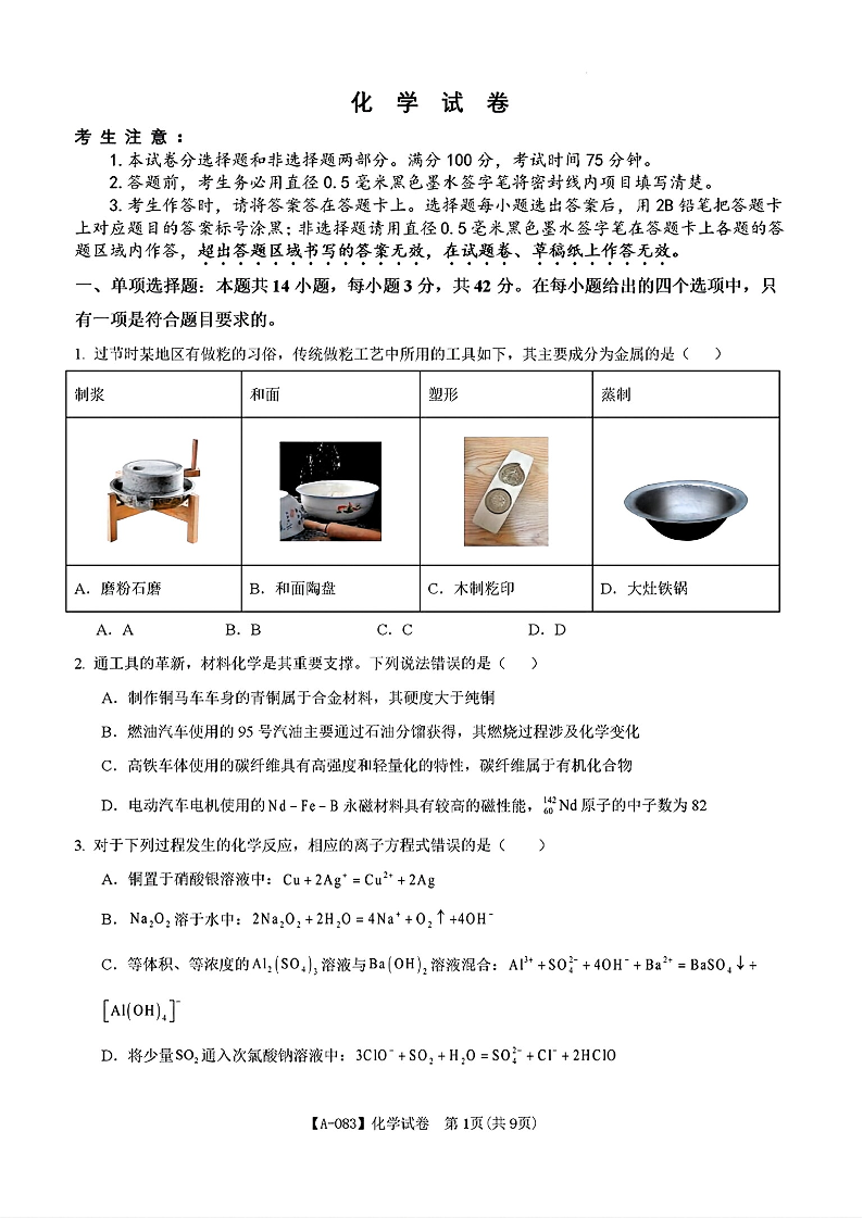 安徽铜陵市2026届高三下学期第一次质检 化学.pdf