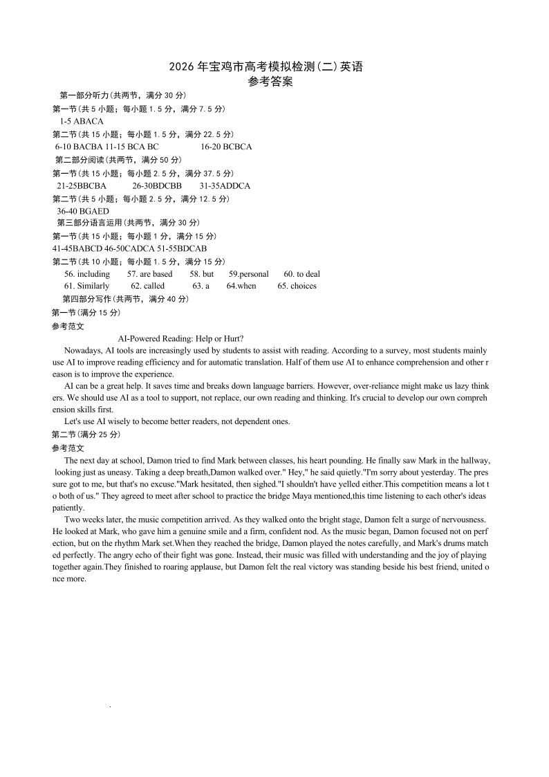 2026年宝鸡市高考模拟检测试题(二)英语答案.pdf