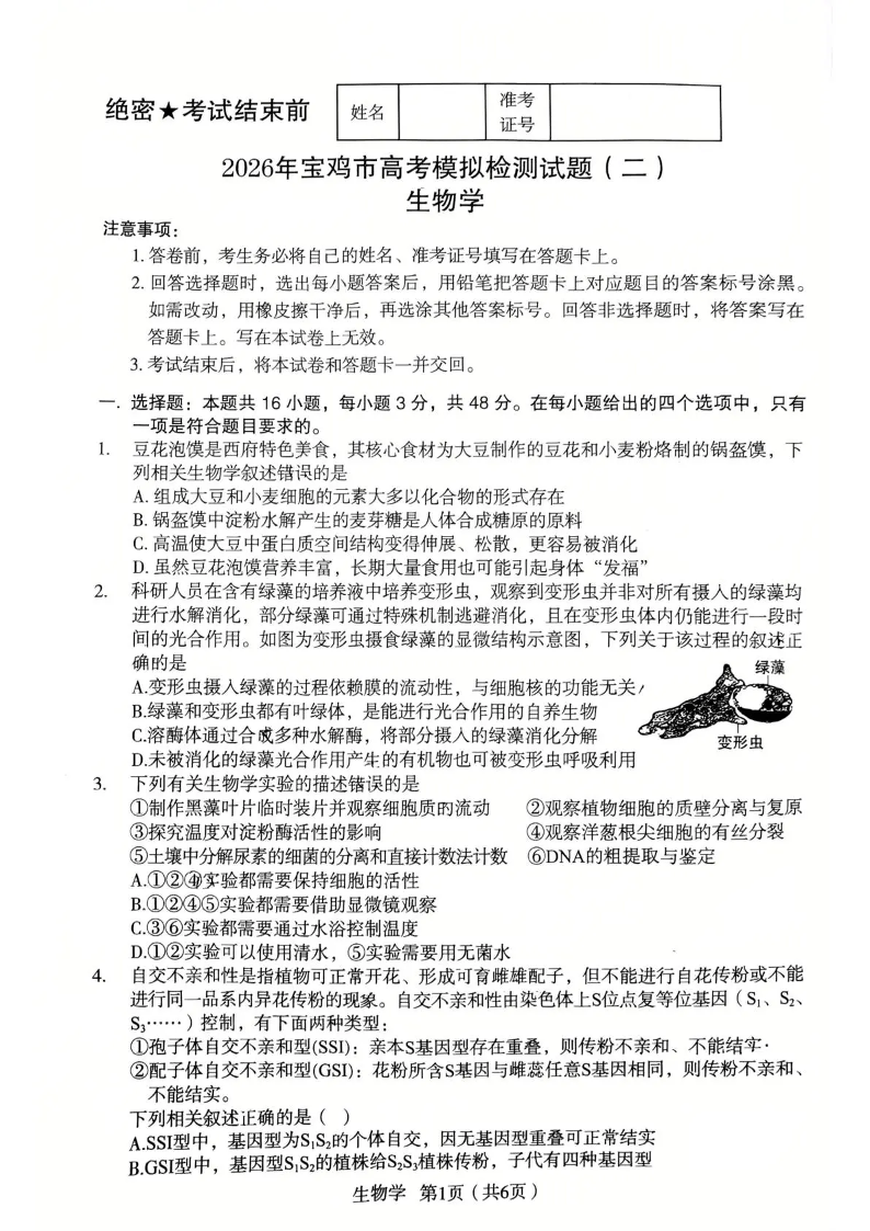 2026年宝鸡市高考模拟检测试题(二)生物.pdf