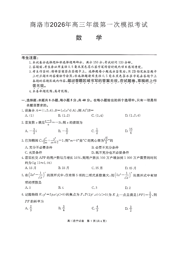 商洛市2026年高三年级第一次模拟考试 数学试题(含答案).pdf