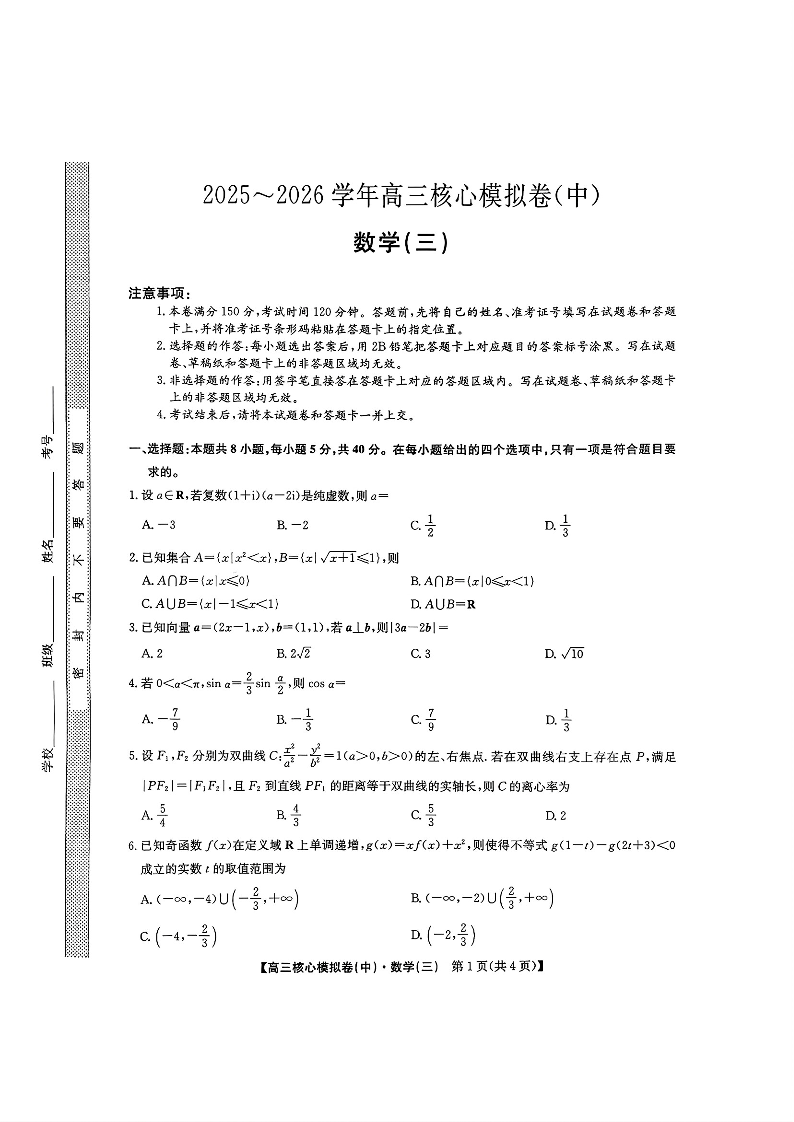 2025~2026学年高三核心模拟卷(中)数学试题(含答案).pdf