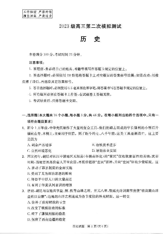 四川省成都市2023级高三第二次模拟测试 历史.pdf
