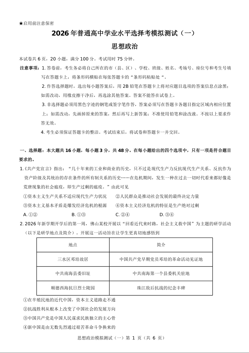 2026年普通高等学校招生全国统一考试模拟测试(一)政治.docx