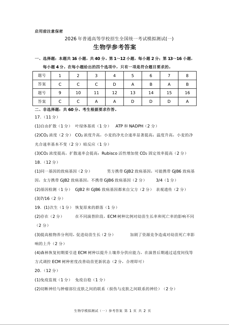 2026年普通高等学校招生全国统一考试模拟测试(一)生物答案.doc