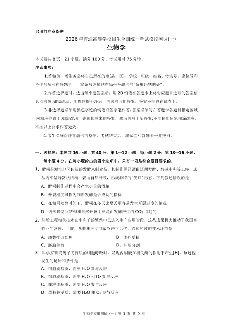 2026年普通高等学校招生全国统一考试模拟测试(一)生物.doc