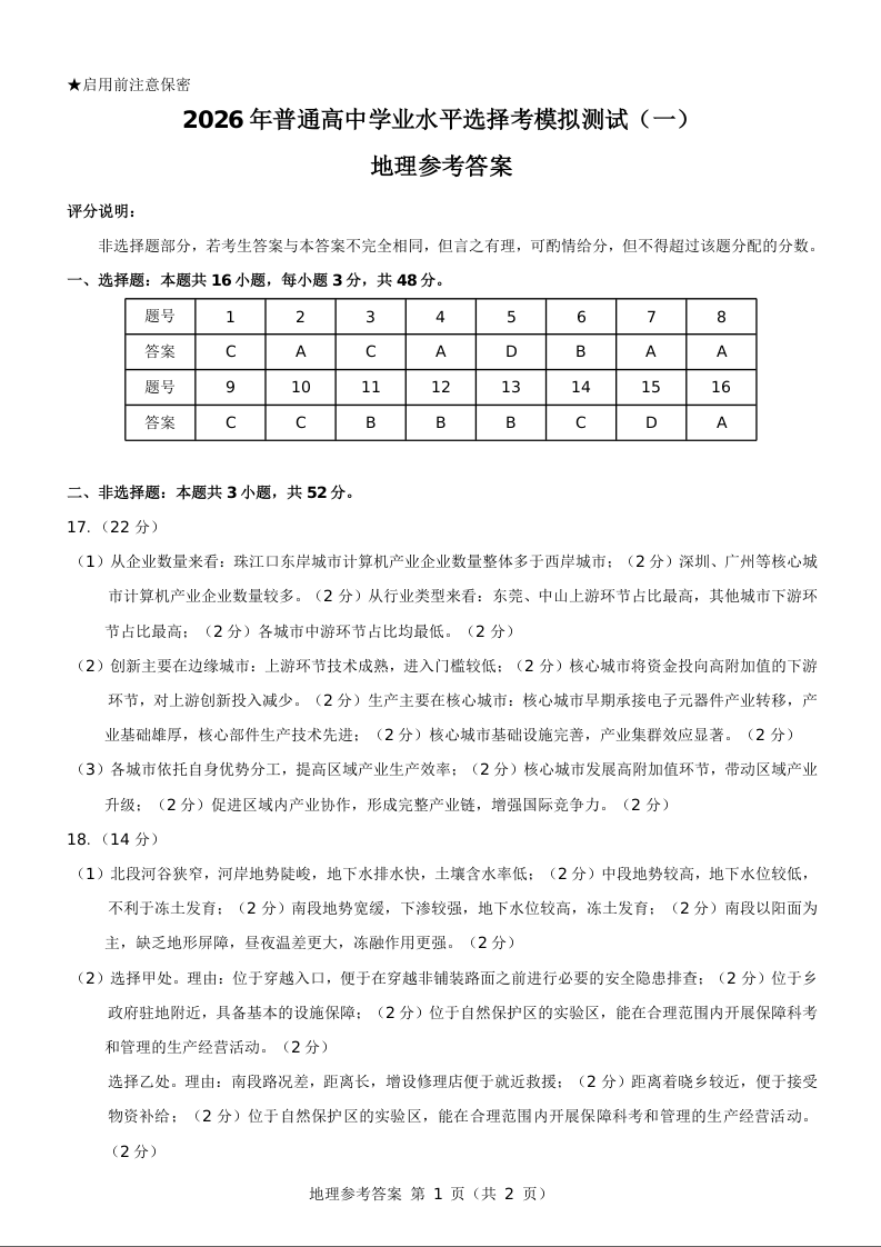 2026年普通高等学校招生全国统一考试模拟测试(一)地理答案.docx