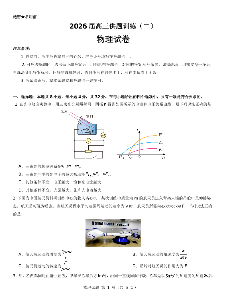 2026届高三供题训练(二)物理试题.docx