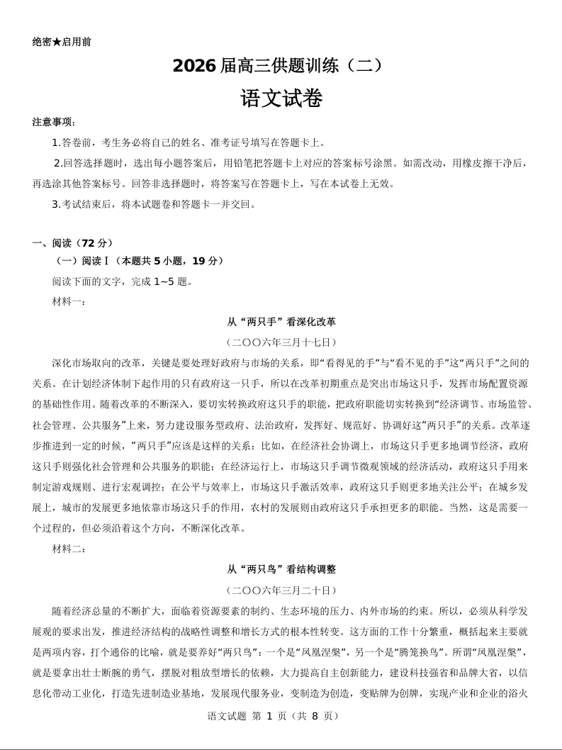 2026届高三供题训练(二)语文试题.doc