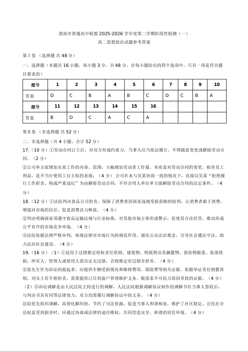 陕西省渭南市普通高中联盟2025-2026学年高二第二学期阶段性检测(一)政治答案.docx
