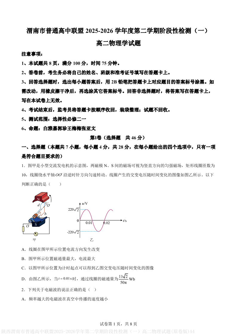 陕西省渭南市普通高中联盟2025-2026学年高二第二学期阶段性检测(一)物理.pdf