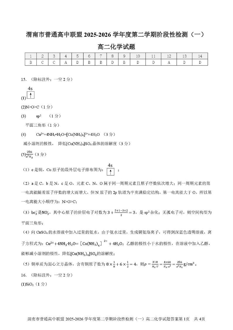 陕西省渭南市普通高中联盟2025-2026学年高二第二学期阶段性检测(一)化学答案.pdf