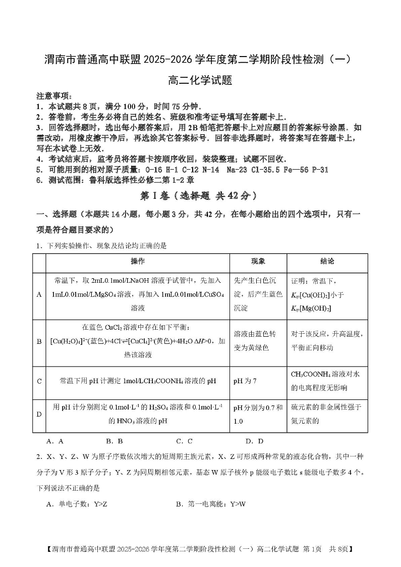 陕西省渭南市普通高中联盟2025-2026学年高二第二学期阶段性检测(一)化学.pdf