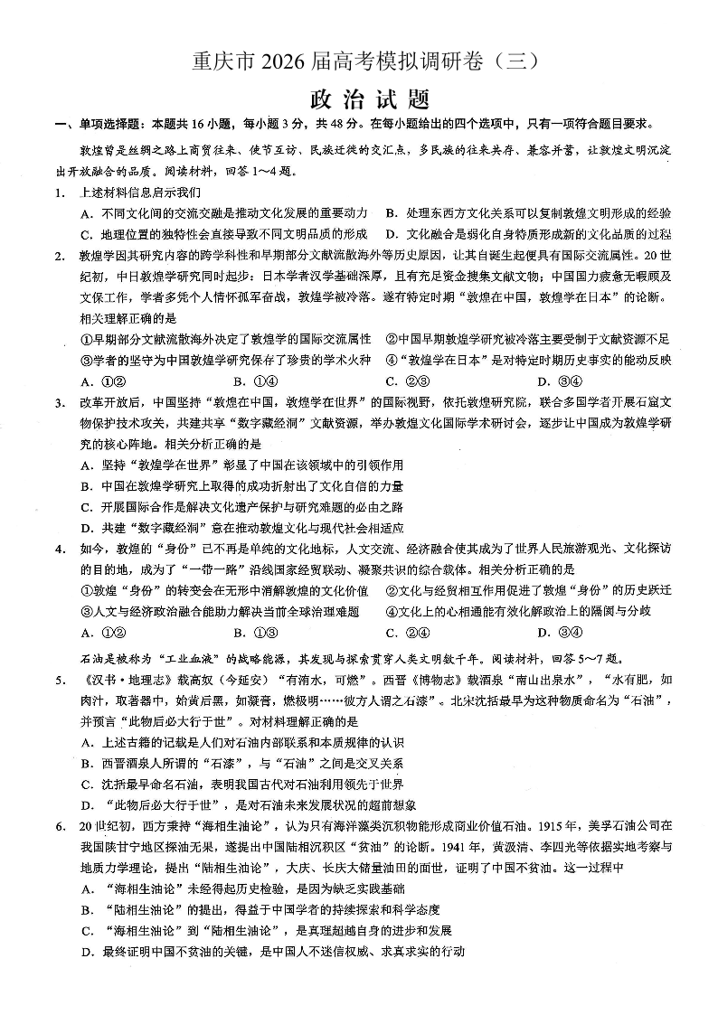 重庆市2026年普通高等学校招生全国统一考试康德调研(三)政治试题(含答案).pdf