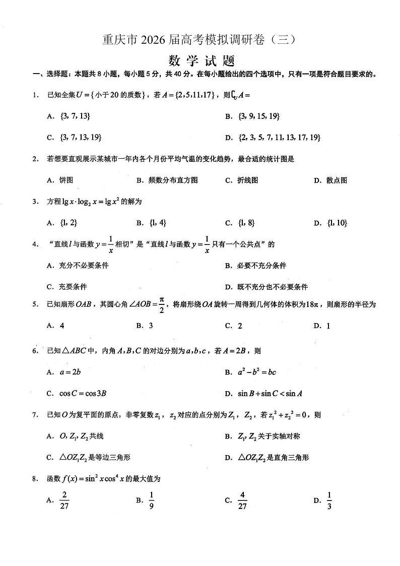 重庆市2026年普通高等学校招生全国统一考试康德调研(三)数学试题(含答案).pdf
